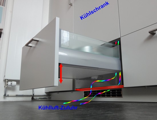 Der Längs-Schlitz unmittelbar unter dem Kühlschrank kommt exakt unter