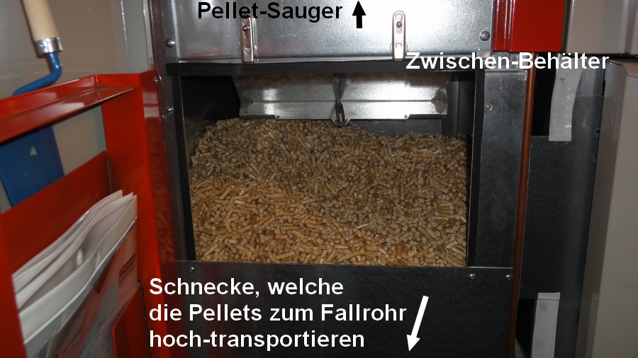 Vom Sauger fallen die Pellets ins Ofen-Zwischenlager